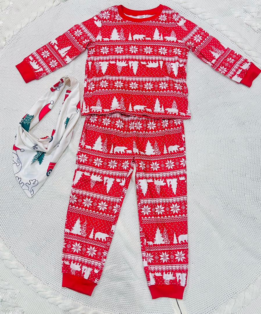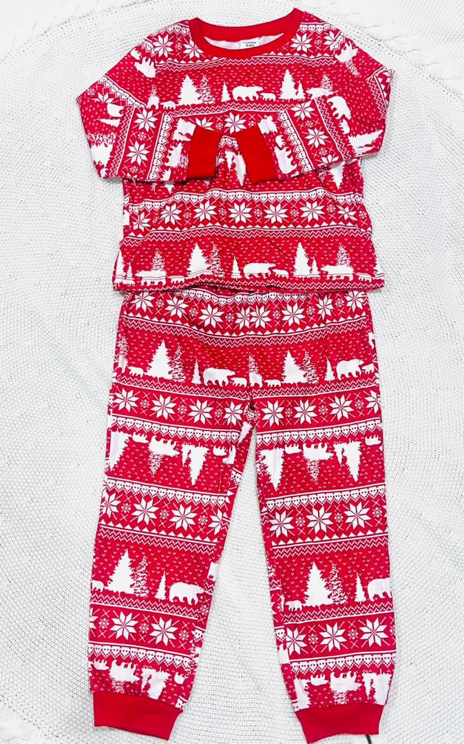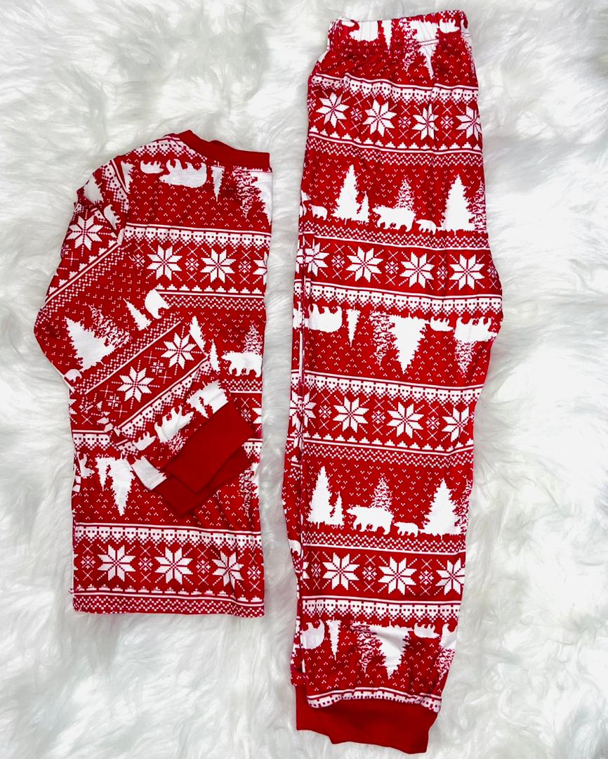 All the Christmas vibes in one cozy set! Bright red, cute winter prints, and perfect for staying warm while feeling super festive.