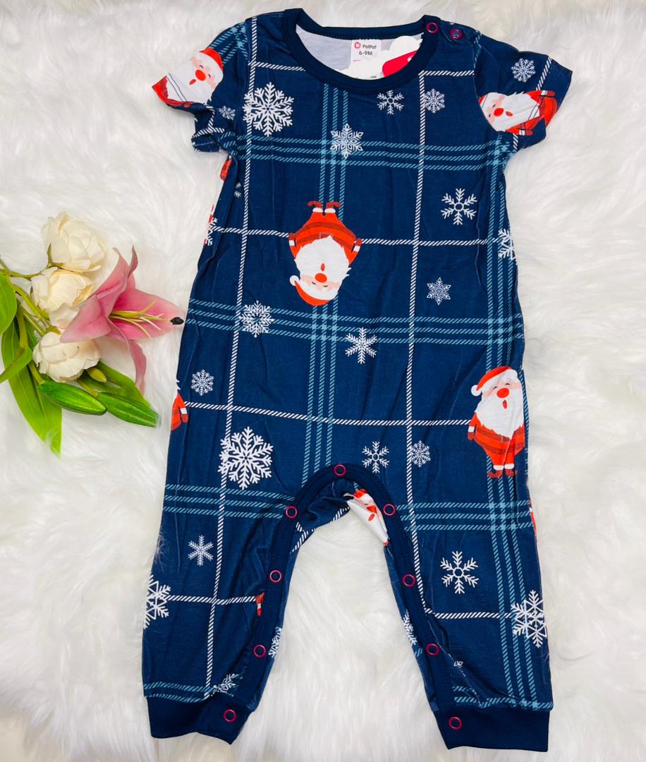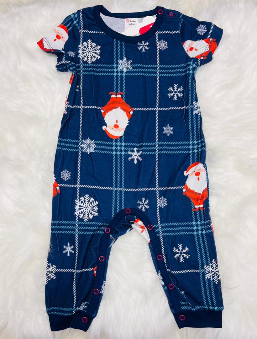 This navy-blue plaid sleepsuit, sprinkled with cheerful Santas and little snowflakes the perfect mix of cozy and festive!
